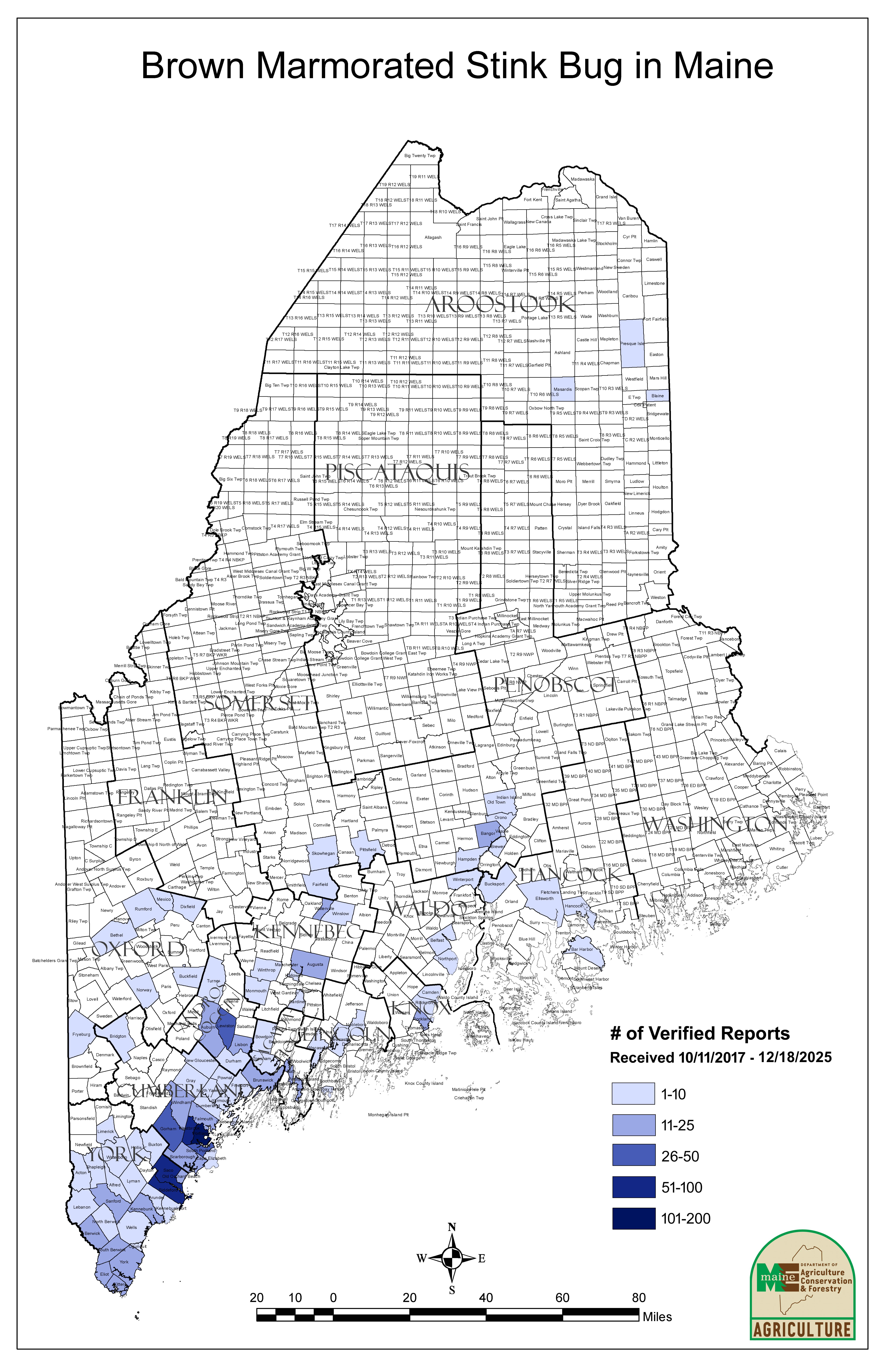 Reports of BMSB overwintering in Maine structures have been verified from 90 towns in 13 counties. Reports of overwintering populations help experts predict and prepare for subsequent potential crop damage.